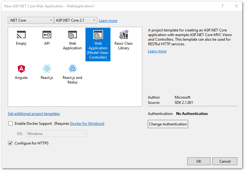 - Chọn Ứng dụng web (Model-View-Controller) và nhấp vào nút Ok.